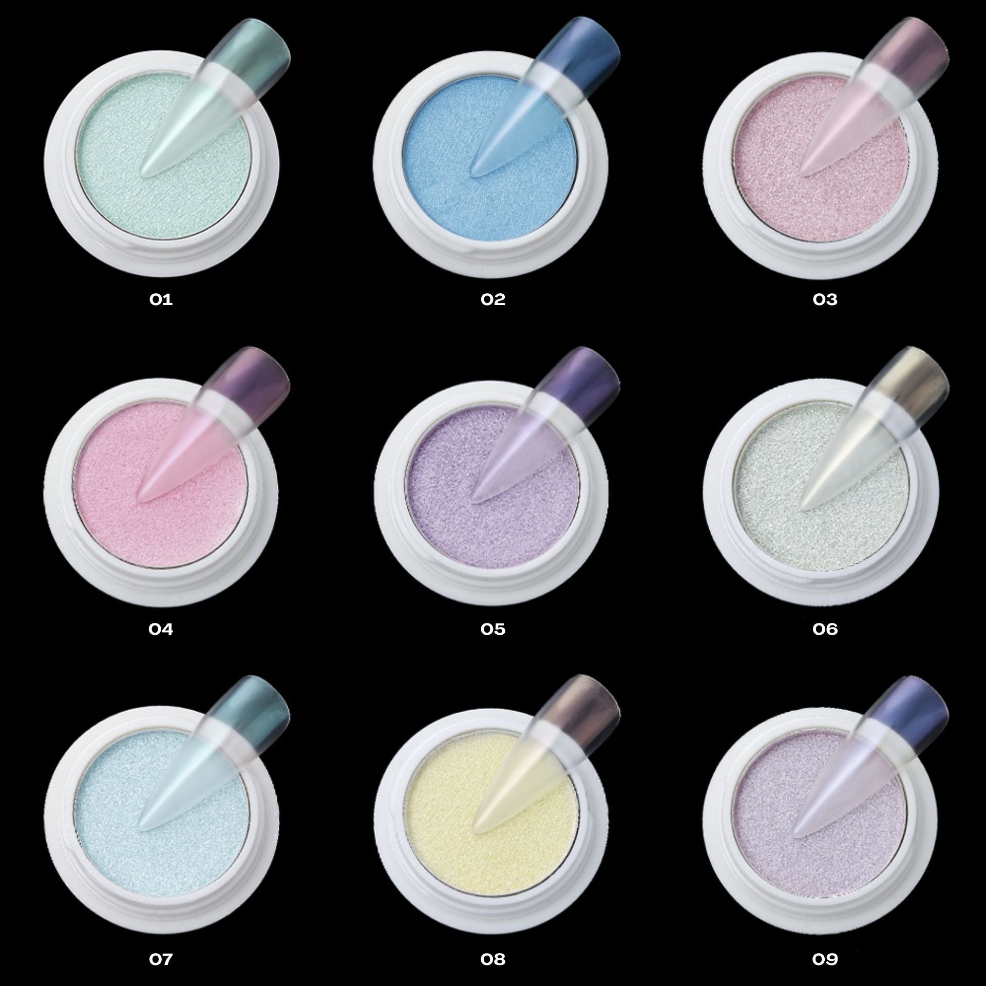 Choose from 9 dreamy colours — from soft pinks to pearly whites and pastel hues — perfect for everyday wear, bridal nails, or adding a touch of ethereal shine to any manicure. Easy to apply over gel or acrylic, the powders blend seamlessly to create a glowing, fairy-dust effect that’s both pretty and professional.