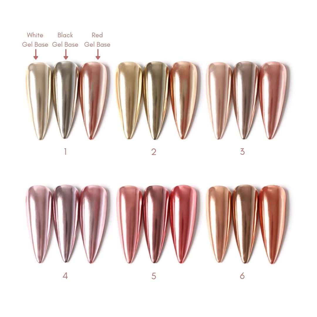 Drench your nails in pure luxury with our Golden Chrome Powder Pen Collection. Featuring six stunning gold tones — from soft Champagne Glow to classic Radiant Gold and romantic Rose Gold — this set is made for nails that shine with elegance.